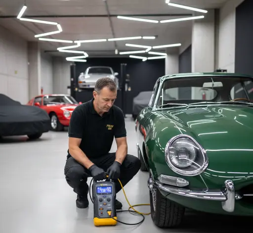 Our specialist care programme ensures your classic remains in peak condition during extended periods off the road. We provide battery trickle charging and tyre pressure checks as standard, while engine run-ups, servicing coordination, and mechanical support are included in our Gold and Platinum packages and available as optional extras with any plan.